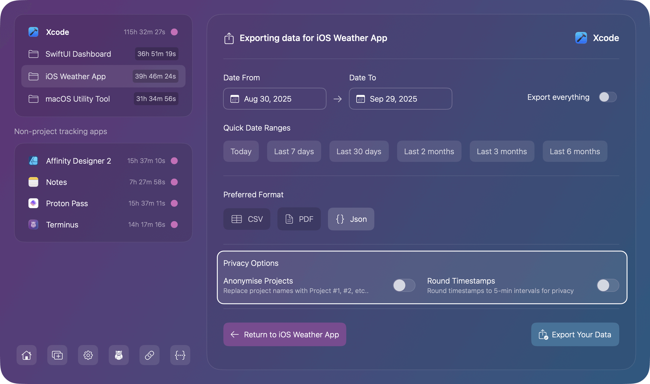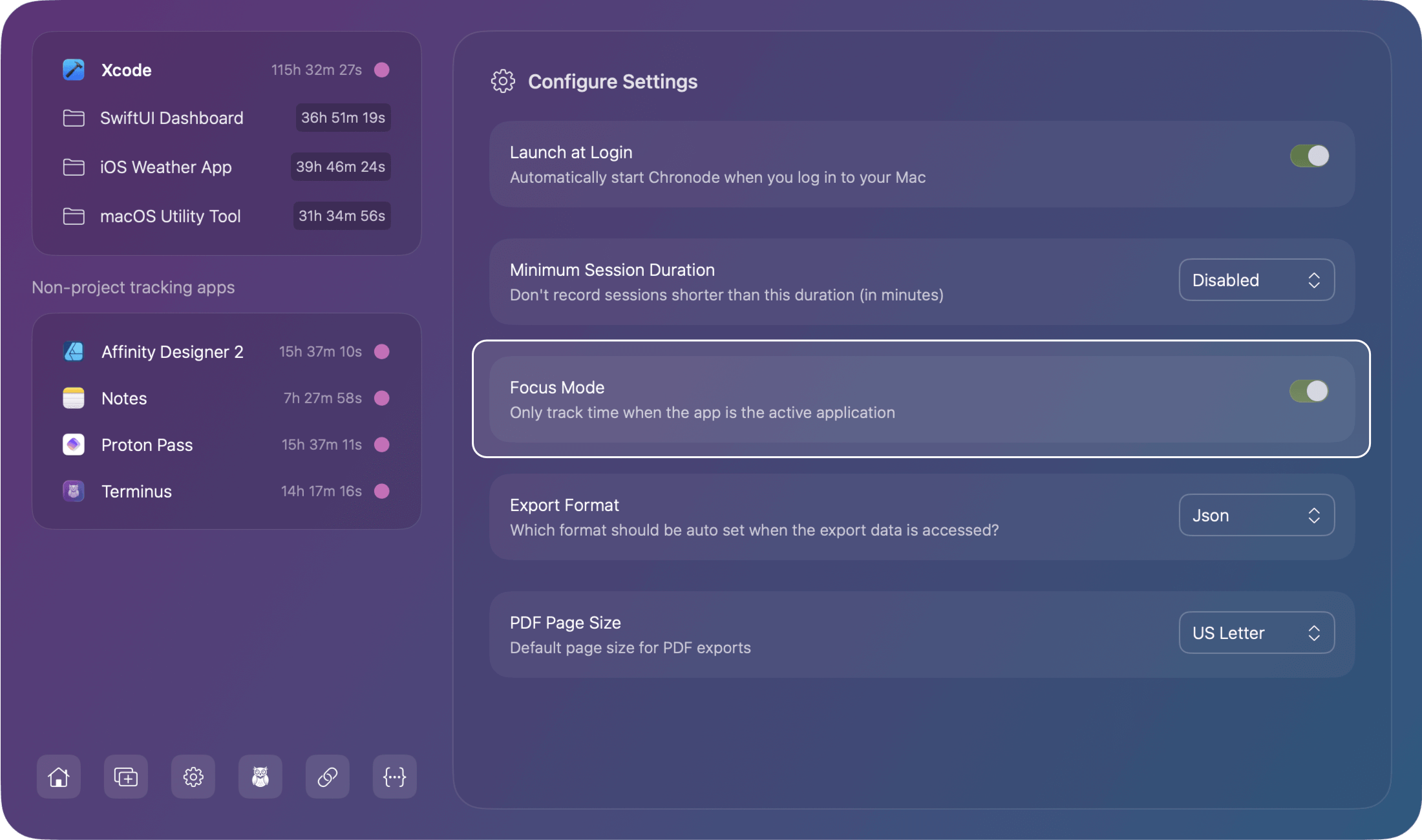 So we built something different. Chronode runs silently in your menu bar and automatically tracks every application you use. When you open Photoshop, it knows. When you switch to Slack, it knows. If you're deep in a code editor working on a specific project, it knows that too. No buttons, no timers, no subscriptions. Just an honest picture of where your time actually goes.